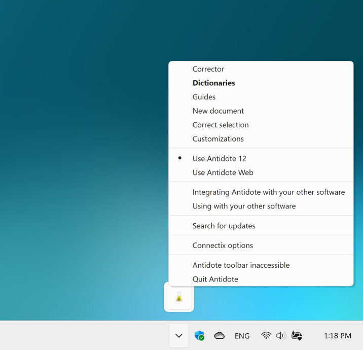 The Antidote Agent is represented by a flask icon in the system tray next to the clock, near the bottom right corner of your screen. You may need to click the chevron to display all the icons in the notification area. Right-click the flask icon to open the menu and access all Antidote’s resources and more.