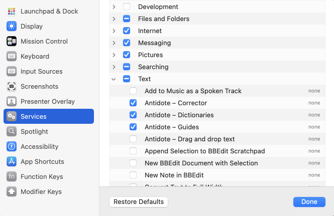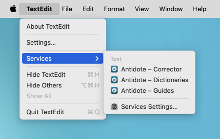 You first need to enable Antidote’s resources before they will appear in the macOS Services menu. You only need to do this once.