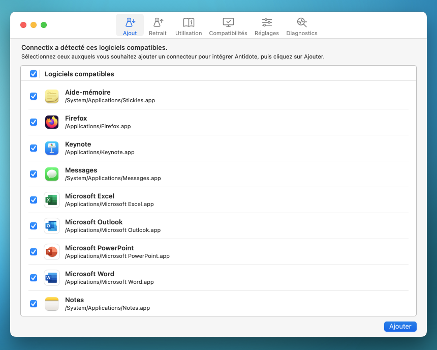 Connectix s’ouvrira automatiquement et affichera la liste de vos logiciels compatibles pour lesquels vous pouvez ajouter un connecteur. Cochez tous les logiciels auxquels vous souhaitez intégrer Antidote (A), puis cliquez sur Ajouter (B).