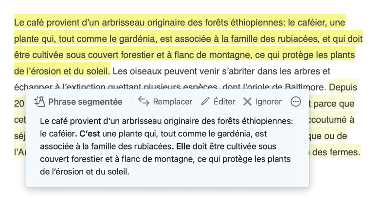 Une infobulle se montre lorsque vous cliquez sur une détection dans le texte et vous propose plusieurs commandes, comme Éditer, Synonymes ou Ignorer. Consultez la section Caractéristiques des détections du volet Style pour découvrir et maitriser toutes les composantes que l’infobulle met à votre disposition.