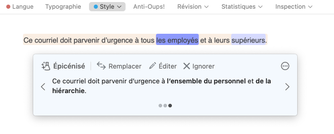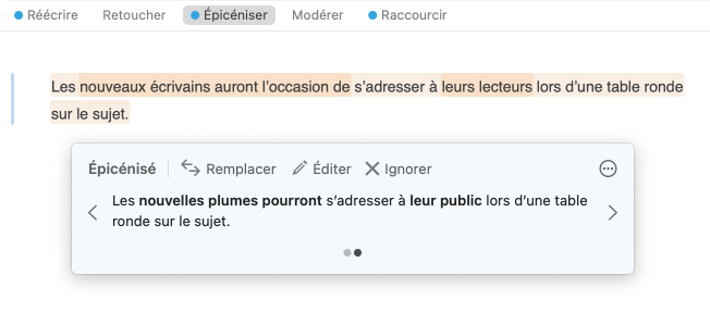 Puisqu’un mot non inclusif peut généralement être épicénisé de différentes manières, Antidote offre souvent plusieurs reformulations pour un passage donné. Le cas échéant, il affiche d’abord celle qu’il juge la plus pertinente en tenant compte du nombre et de la nature des changements impliqués. Pour comparer les reformulations et opérer votre choix, cliquez sur les chevrons de part et d’autre de la reformulation courante, ou encore sur les pastilles grises au bas de l’infobulle.