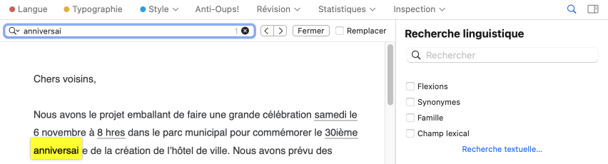 Cliquez sur la loupe dans la barre de navigation. Entrez un mot (ou une chaine quelconque) dans la zone de recherche, et la Recherche linguistique en indique toutes les occurrences dans le texte. En particulier, l’option Flexions vous révèle toutes les formes d’un mot (ouvrir, ouvrira, ouvert, etc.). Grâce aux options Synonymes, Famille et Champ lexical, explorez les écrits comme vous ne l’avez jamais fait auparavant. Le réseau sémantique du texte, qui en tisse la connotation et révèle toute sa profondeur, se dessine devant vos yeux. Naviguez sur les résultats directement dans le texte ou retrouvez-en la liste complète, sous les options dans le panneau de droite.
