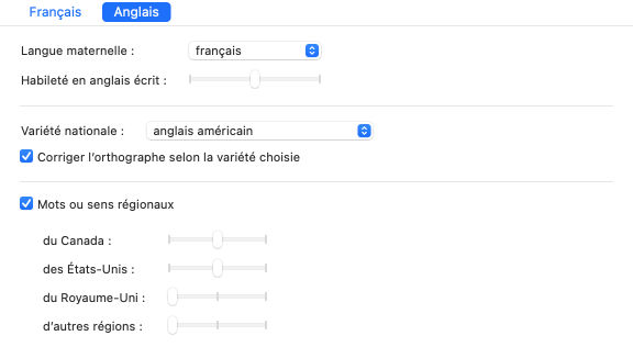 - Les régionalismes signalés par le filtre Vocabulaire du volet Style dépendent de la valeur de ces réglages.