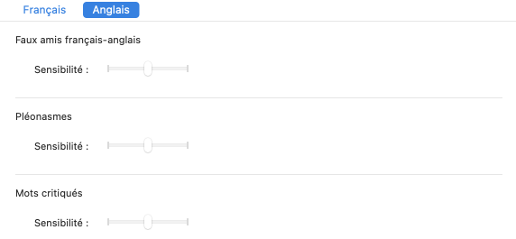 - Niveau maximal (habileté jugée très bonne) : Antidote applique ses corrections habituelles, mais ne récupère pas certaines erreurs qu’une personne très habile en anglais n’est pas susceptible de produire.