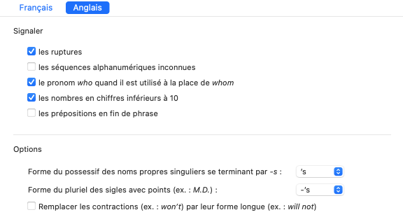 Ce réglage permet d’exiger ou de refuser la virgule après i.e. et e.g., ou encore d’accepter les deux emplois.