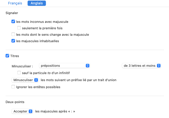 Cochez la case générale Titres pour qu’Antidote corrige l’emploi des majuscules dans les titres et les sous-titres. En règle générale, tous les mots prennent la majuscule initiale, excepté les articles, les conjonctions de coordination et les prépositions courtes. Cependant, les conventions concernant les majuscules dans les titres varient selon les guides de style; des options plus fines, décrites ci-dessous, permettent de personnaliser la correction selon vos préférences.