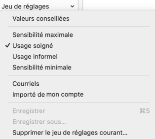 Si vous écrivez en temps normal des courriels où un ton familier est de bon aloi, vous choisirez sans doute une combinaison de réglages tolérante, Usage informel. Lorsque vous aurez une lettre importante à rédiger et souhaiterez des réglages plus sévères, vous choisirez Usage soigné ou Sensibilité maximale. Une fois votre correction terminée, le menu des jeux de réglages vous permettra de retrouver sans tarder vos réglages plus permissifs. Dans le menu, un crochet marque le jeu actif, s’il y a lieu.