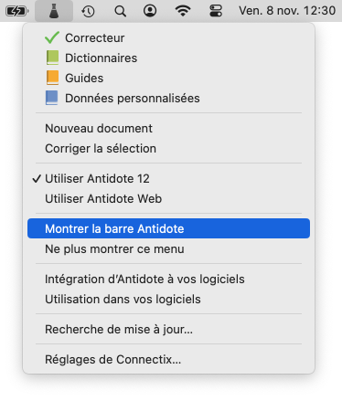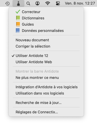 Dans la barre des menus située en haut à droite de l’écran, une fiole monochrome représente l’Agent Antidote. Depuis son menu, vous pouvez appeler tous les ouvrages d’Antidote, et bien plus.