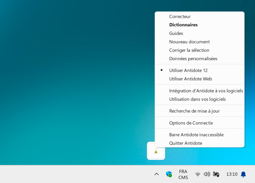 Dans la zone de notification de la barre des tâches située en bas à droite de l’écran, une petite fiole représente l’Agent Antidote. Au besoin, cliquez sur le chevron pour dévoiler toutes les icônes de la zone de notification. Faites un clic droit sur l’icône de la fiole d’Antidote pour ouvrir le menu. Il permet d’accéder aux ouvrages d’Antidote, et bien plus.