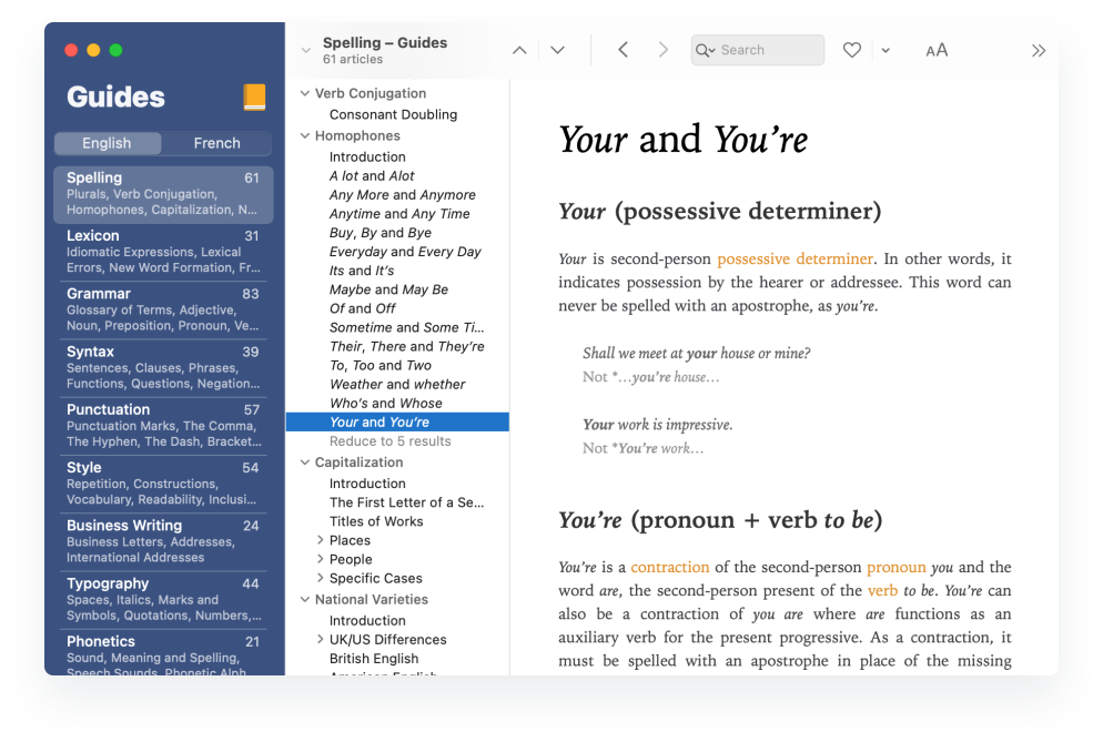 - Confused words: there/their/they’re, its/it’s, whose/who’s, etc.