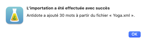 Une fenêtre fournit des indications sur le résultat de l’importation. Antidote indique entre autres le nombre de mots qui ont été ajoutés, modifiés et rejetés.