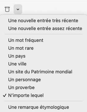 • En cliquant sur le menu à droite du chapeau, vous pouvez restreindre la recherche à une seule des catégories affichées. À l’installation, Antidote tire au hasard parmi ces catégories.