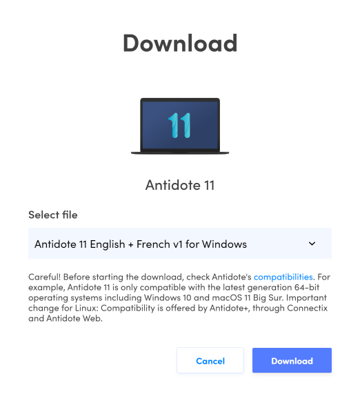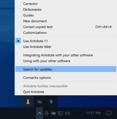 Make sure to keep your Antidote software up to date. To check whether updates are offered for your version of Antidote, right-click on the Connectix Agent (the small flask in the notification zone) and select Search for updates. This function is also offered in the Antidote 11 Help menu.