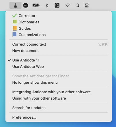Make sure to keep your Antidote software up to date. To check whether updates are offered for your version of Antidote, open the Help menu and select Search for updates. This function is also available in the Connectix Agent menu (the small flask in the menu bar).
