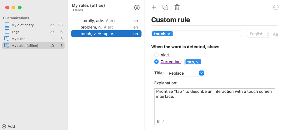 A rule consists of a trigger, a detection type, an optional replacement word and an explanation. It generates a detection, which can be defined as either an alert or a correction.