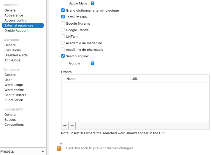 You can also add likes to any other online resources of your choice. Click the “+” button to add a URL and the “-” button to delete one. In the string of the URL, use the %s variable to indicate where Antidote should insert the word to look up.