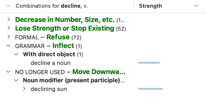 A blue bar opposite each combination shows its relative statistical strength: the longer the bar, the stronger the combination in comparison with the other combinations in the same context. The strength depends on a combination’s frequency, but also on the uniqueness of the association between the terms.