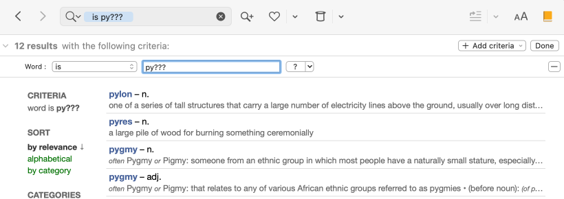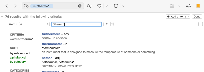In some situations, you may want to search for a word even if you don’t know all the letters. Maybe you’re missing a five-letter word starting with py to finish your crossword, or you’re writing an assignment on heat sources and are looking for words containing the string thermo. Searching with variables is an excellent way to find the word or words you’re seeking.