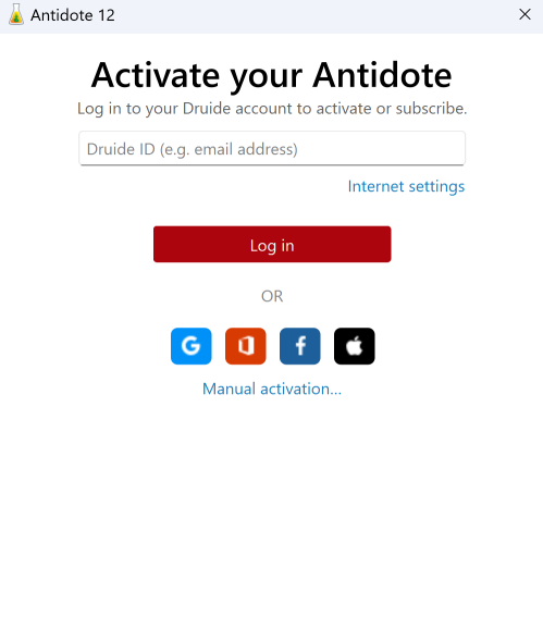 11 — Enter your Druide ID and your password, or use one of the single sign-on services, to activate your Antidote 12. This is the same log-in information you use for your Client Portal.