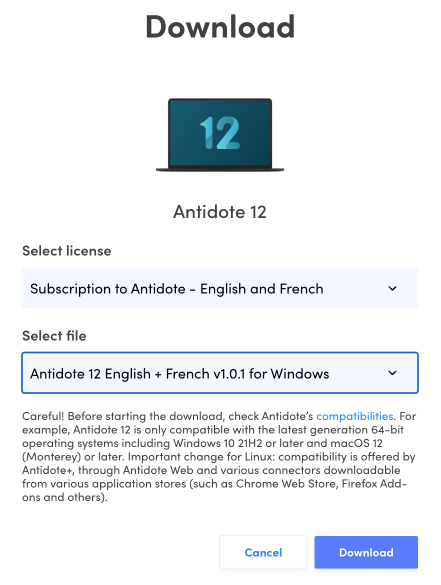 Make sure to keep your Antidote software up to date. To check whether updates are offered for your version of Antidote, right-click on the Antidote Agent (the small flask in the notification zone) and select Search for updates. This function is also offered in the Antidote 12 Help menu.