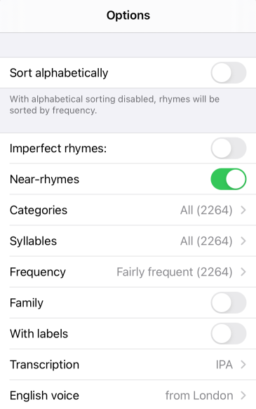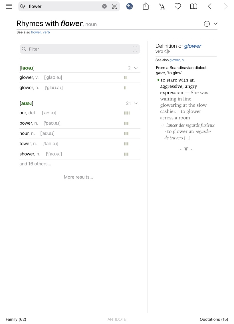 Antidote’s rhymes dictionary lets you find words and expressions that rhyme with a given word. In addition to perfect rhymes, it also suggests words that do not exactly rhyme, but which share other phonetic similarities such as assonance or consonance. You’ll find everything you need for your poetry, songs and slogans!