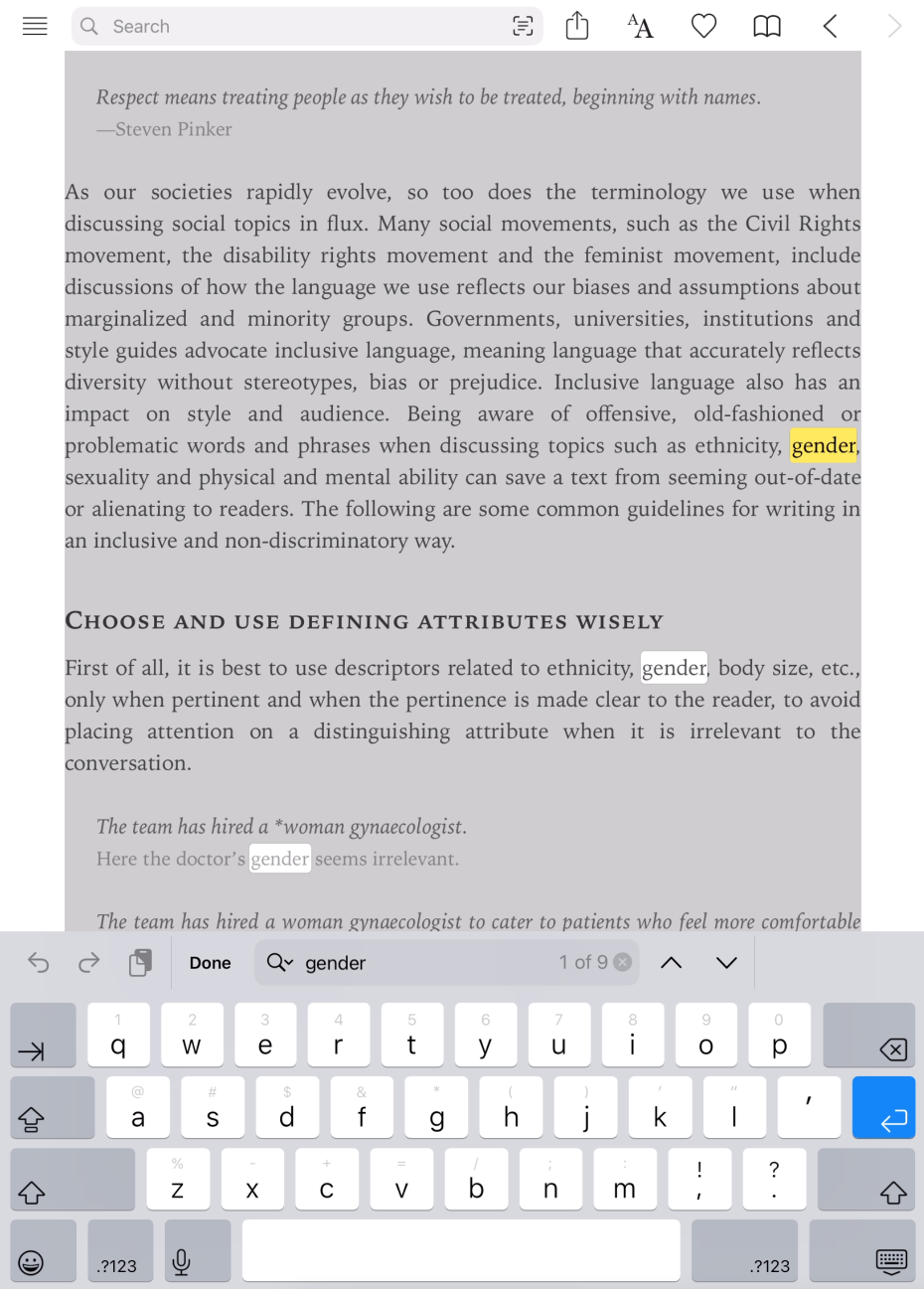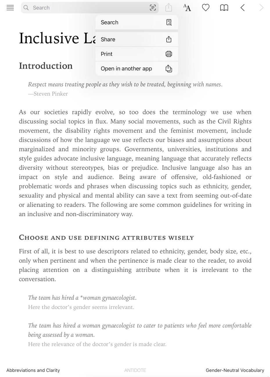 Find a specific word or expression in a long dictionary entry or guide article with the search function under the action button menu (1).
