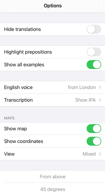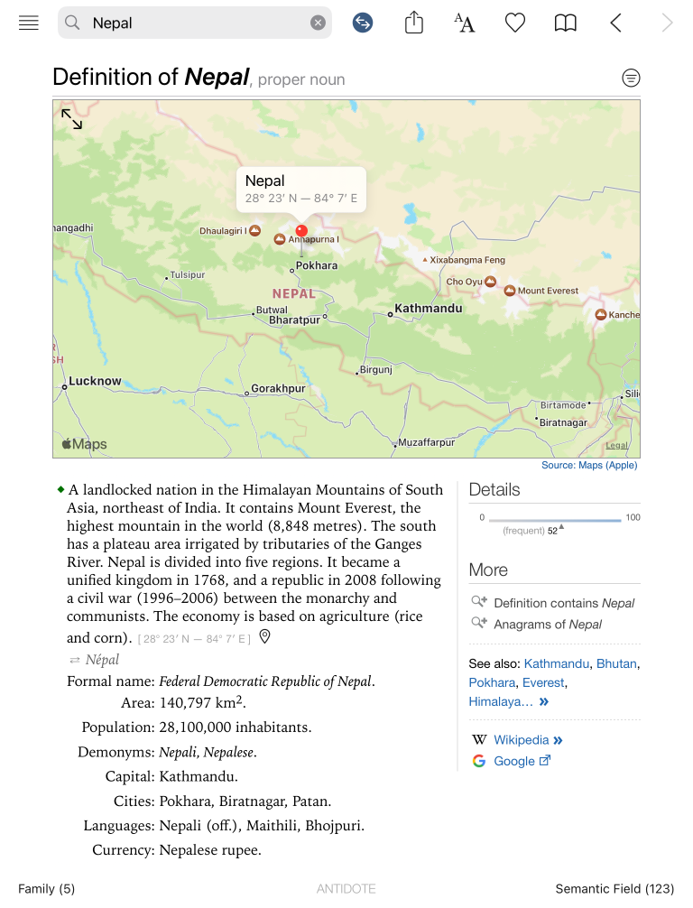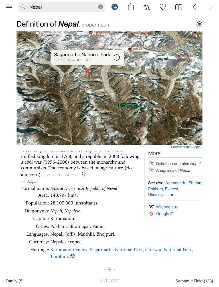 Note — On iPhone, the map is always shown in a separate panel. On iPad, the map is integrated into the definitions page if the Show the map option is activated. An Internet connection is required to display the maps.