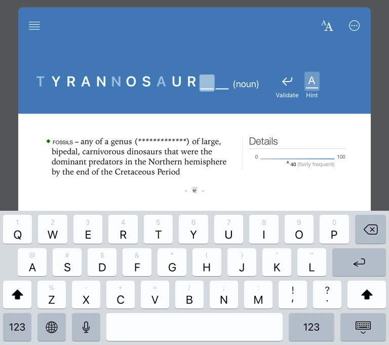 Discover words while having fun! Test your knowledge by guessing words based on their definitions. Choose a category or quiz yourself on your word lists or recent discoveries.