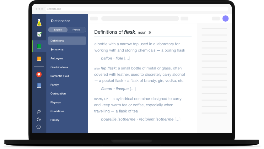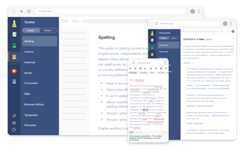 Access the application online at antidote.app. Use the powerful corrector, the comprehensive dictionaries and the detailed language guides directly in your favourite browser.