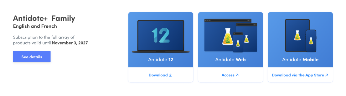 Whether you have access to Antidote Web as part of an Antidote+ subscription or through your organization, getting started is easy! Click the tab below that corresponds to your situation to learn more about how to connect for the first time.