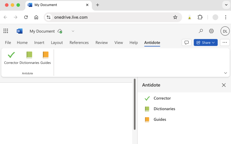 Important — Keep the Antidote panel on the right open. It is essential for maintaining communication between the two applications. You can also use the buttons in the panel to access Antidote’s tools.