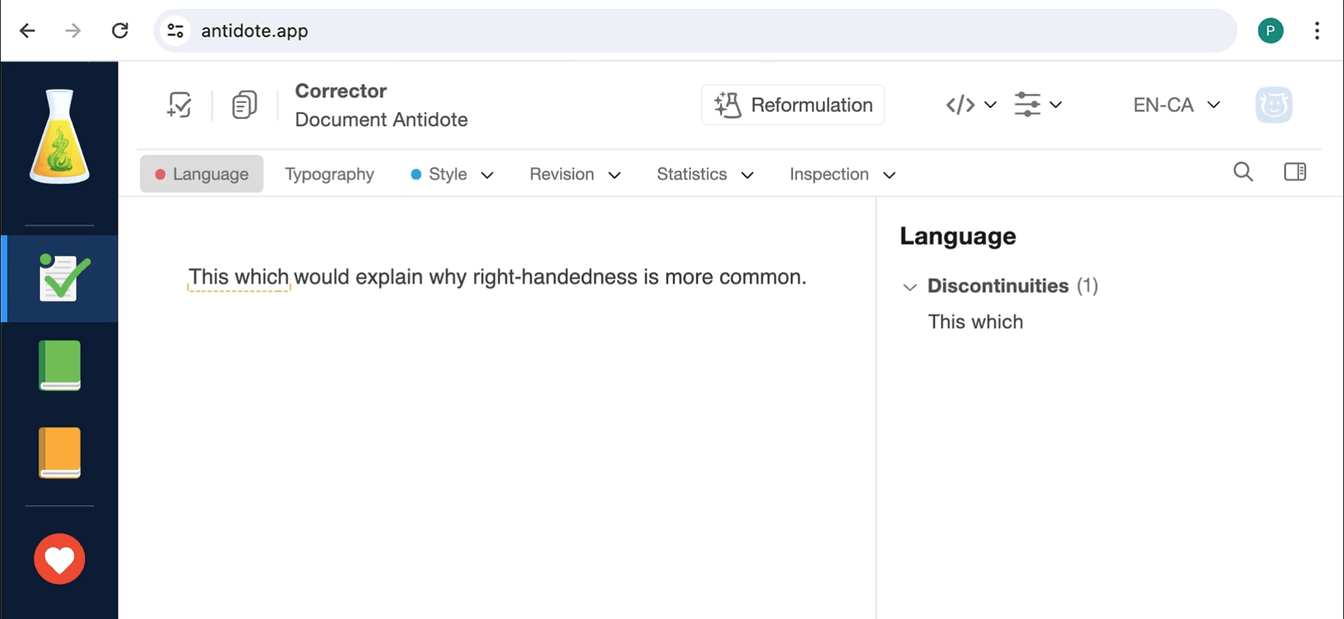 MP: To give you a more concrete example of what’s possible with Antidote: You can now use the Reformulation feature to resolve discontinuities flagged by the application. Discontinuities are bits of text the corrector marks with dotted orange underlining to indicate where it has trouble analyzing the text.
