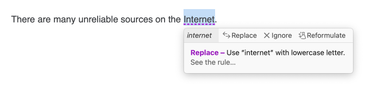 Publish a custom preset to remind everyone to use a comma as a separator for groups of three digits (56,789, not 56 789). Add your proper names, such as The Monday News, to a custom dictionary to standardize their spelling and capitalization. Share your organization’s custom rules, for example, that the word internet should be spelled in lowercase. Antidote will flag any oversight directly in the corrector, ensuring your writing conventions are followed.