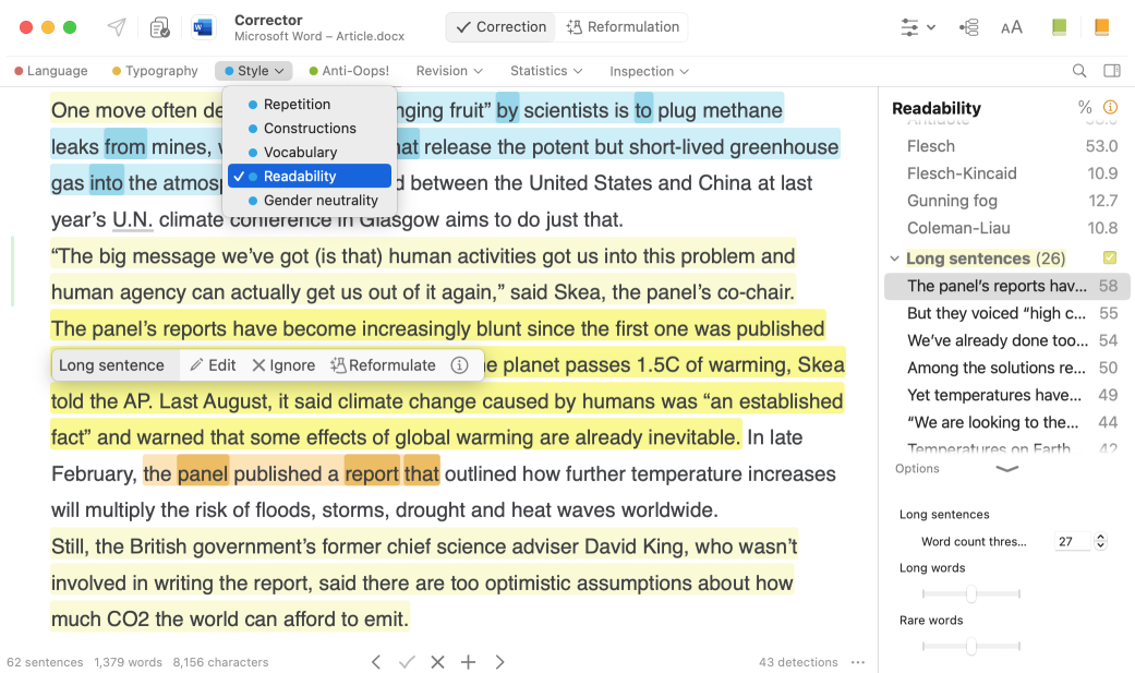 The Readability filter highlights long sentences so you can spot them more easily. You can even adjust the number of words (A) after which a sentence is considered long by clicking the filter options banner. All you need to do next is break up your ideas to clarify the text, or ask Antidote to do it for you by clicking the Reformulate option (B) in the tooltip.