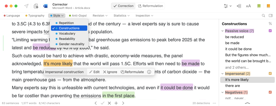Impersonal constructions shouldn’t always be avoided, but sometimes they can lead to confusion about the subject or make the text feel clunky. To quickly spot impersonal phrases in your text, use the Constructions filter.