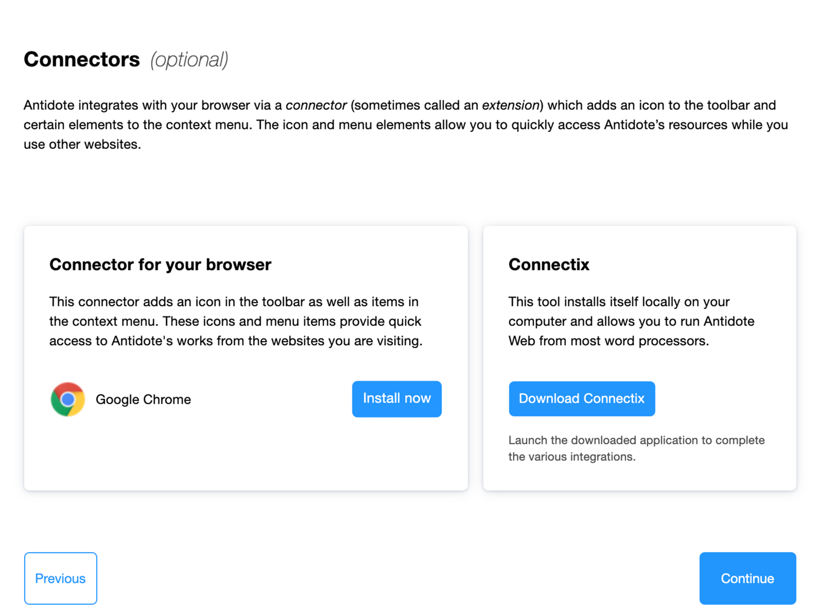 The screen titled Connectors allows you to download and add the elements necessary for integrating Antidote with other applications. This important step can be done now or later (see our article on integrating Antidote with Word). To access the corrector right away, click Continue.