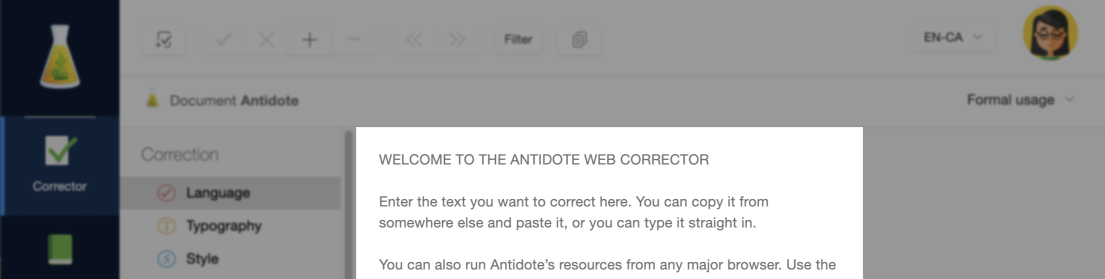 Type or paste your text in the central corrector window. Antidote Web will analyze it immediately.