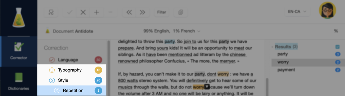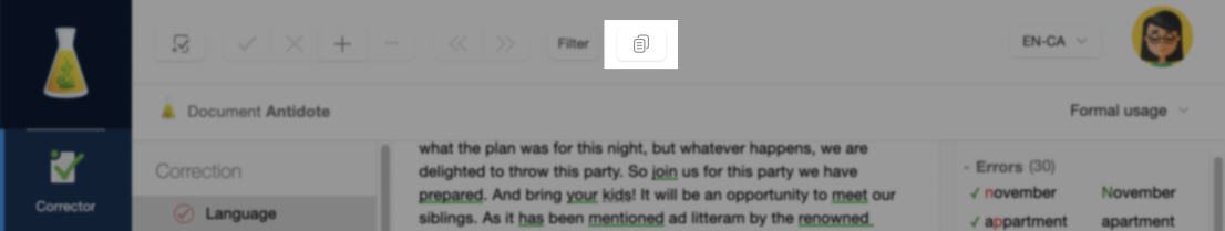 Now that you have taken your first steps, you will quickly get a taste for Antidote’s corrector! This is the fastest way to try the corrector, but there is still so much to discover! We invite you to explore the interface and to browse our abundantly illustrated User Guide.