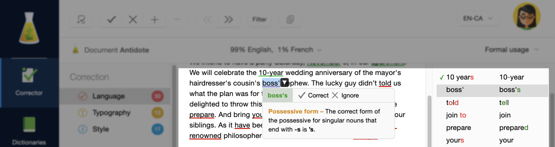 Go through each of the corrector’s detections. The list of errors, alerts and other things that require your attention are displayed in the right-hand panel. Click on an item in this list or directly on the underlined word in the text to bring up the tooltip and its explanations.