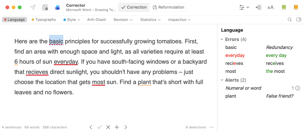 The corrector detects a wide range of errors: spelling, punctuation, conjugation, possessives, false friends, irregular syntax, and more. It underlines what you need to correct or double-check, while providing solutions and explanations. And you always get to decide which changes to apply.