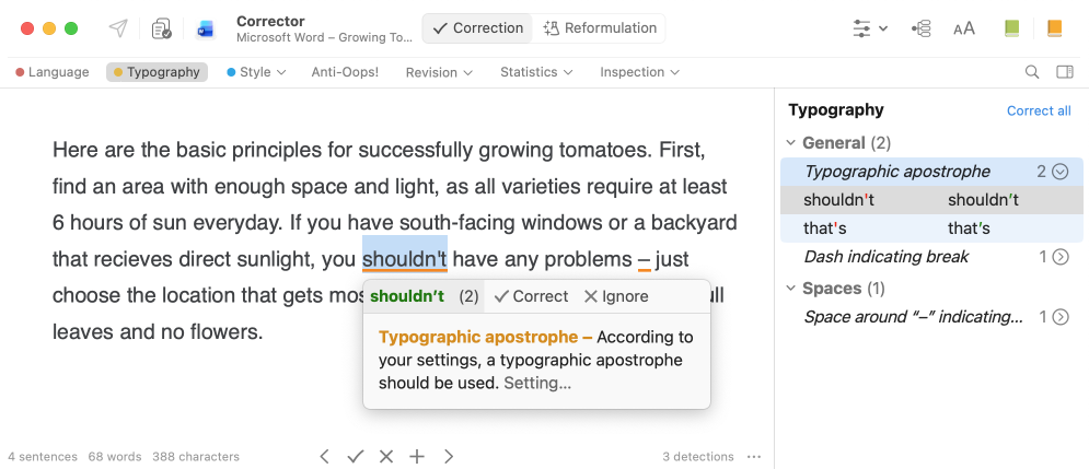 Once launched, Antidote opens your text in the corrector. All the changes you make will be directly applied to the original document. No need to copy-paste!