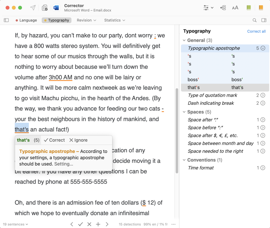 Antidote takes care of applying corrections to your text according to the most commonly accepted typographical standards, or according to the settings you have defined (we will discuss this in the next section of this article).