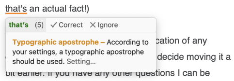 Otherwise, you can also indicate your preferences as you revise a text. In the tooltip linked to a detection, the word Setting following an explanation opens the appropriate panel for a targeted and quick modification.