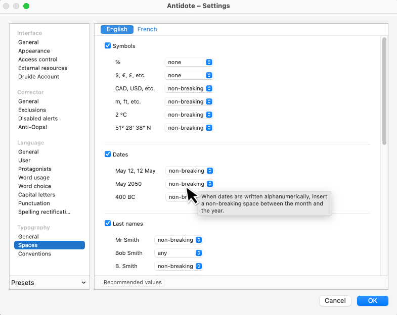 In each panel, a Recommended values button allows you to reset the default settings for your language variety. Indeed, the choice you made when you first opened Antidote to indicate your variety of English affects the default values of these settings. For example, in British standards, first-level quotes use single quotation marks and embedded quotes use double quotation marks. North American standards recommend the opposite!