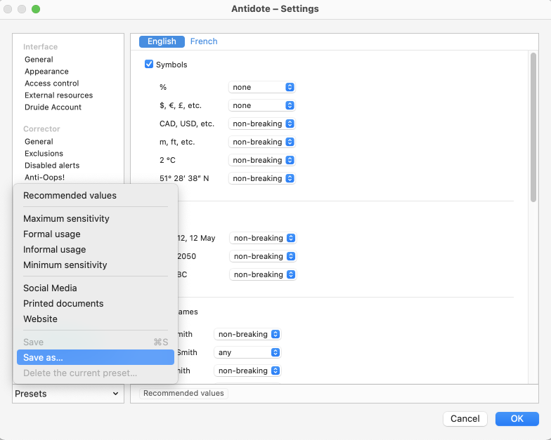 They can be particularly useful for texts that have specific typographical needs, depending on the language variety of the recipients or the type of publication. For example, you can define a preset for social media, where thin and non-breaking spaces are not supported.