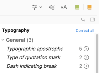 Typographic detections are very consistent. The same spacing applies, for example, after all periods and commas in a text. The corrector opts for a generic presentation rather than a specific one. Thus, typographical detections in the same context are grouped under a single generic title, displayed in italics: Dash indicating break, Typographic apostrophe, etc.