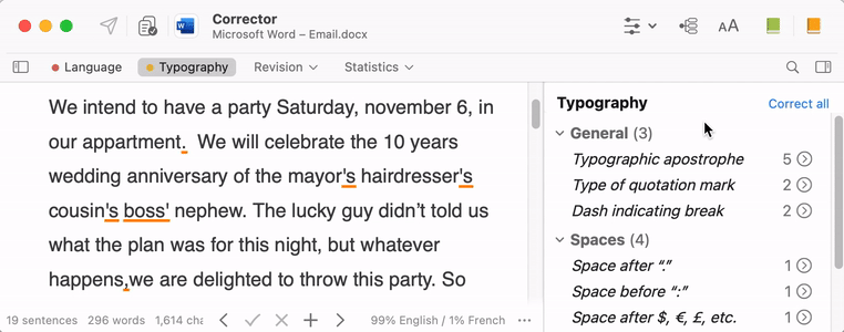 Since typographical corrections do not really require deep thought, Antidote offers you the option of processing them in batches. Double-click on a generic title to fix the relevant subset or click Correct all above the list of detections to, you guessed it, correct all.