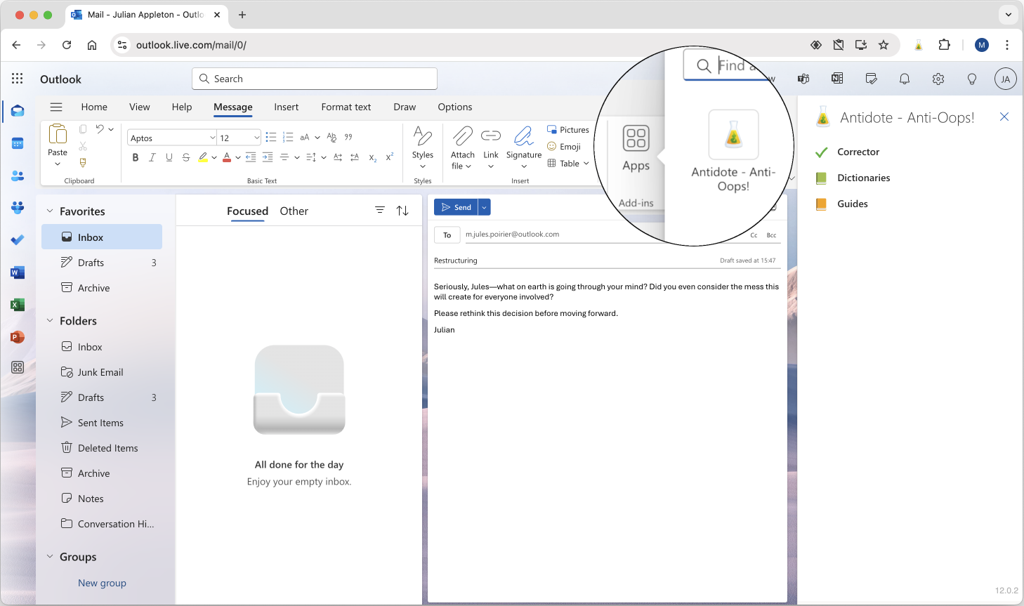 Once you add the Antidote Connector to Outlook, Anti-Oops! springs into action as soon as you click Send. If you want to revise your message before sending it, go to the Message ribbon (1), click the Apps icon and select the Antidote panel (2), then select the tool you want to use (3).