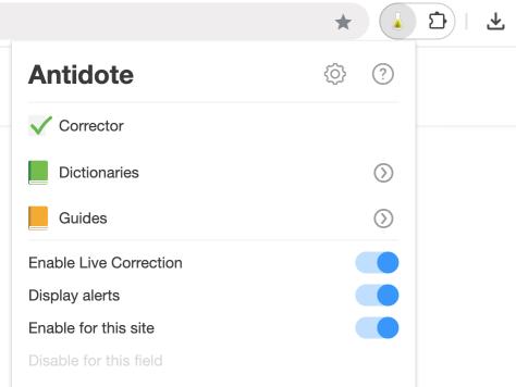 Want to consult a particular resource? Click Antidote’s flask icon in the browser’s toolbar. You can select not only the corrector, but also the dictionary or guide you want to open using the chevron .
