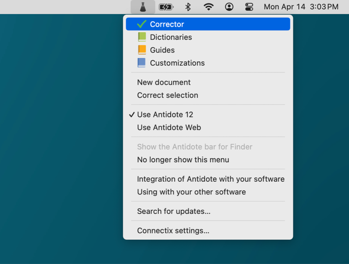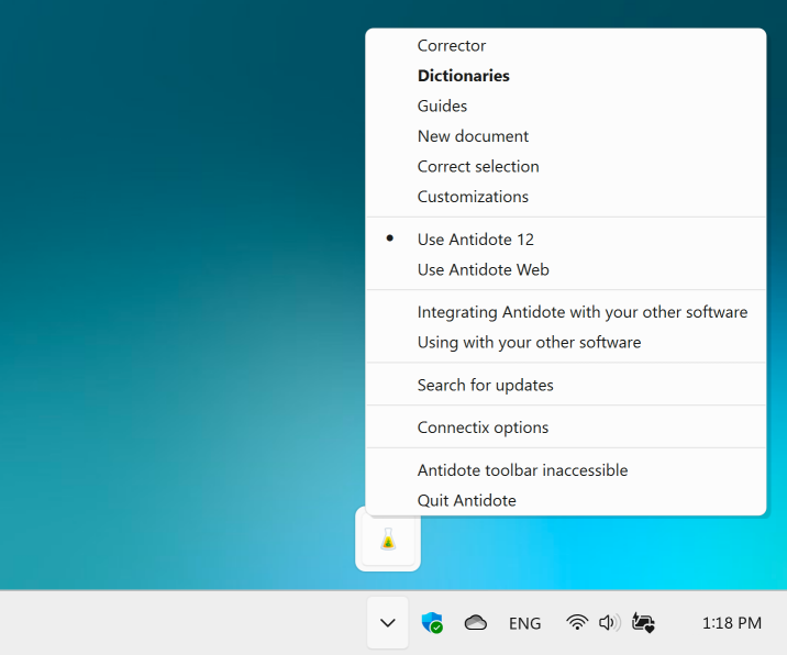 If you use the desktop version of Word (rather than the web app), you can also run Antidote by using the Antidote Agent. Click the flask icon in the menu bar on a Mac or in the notification area in Windows (click the chevron, then right-click the flask). Then, select Corrector, Dictionaires or Guides from the menu that appears. Even though it seems to be running outside of Word, the Antidote Agent locates the active window you’re working in and launches Antidote’s language tools just like the Antidote menu.